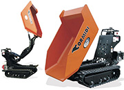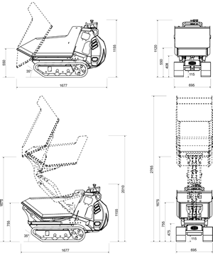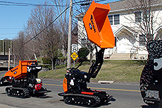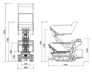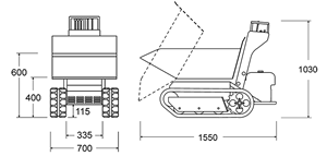 小粒ながら全油圧駆動・フルHSTで積載荷重550 Kg / 600 kgの油圧ダンプのみの基本モデルの仕様機 は、クローラー全幅が 690mmと細身でドアも簡単に通るサイズで裏庭にも入り込め、狭い現場で威力を発揮します。